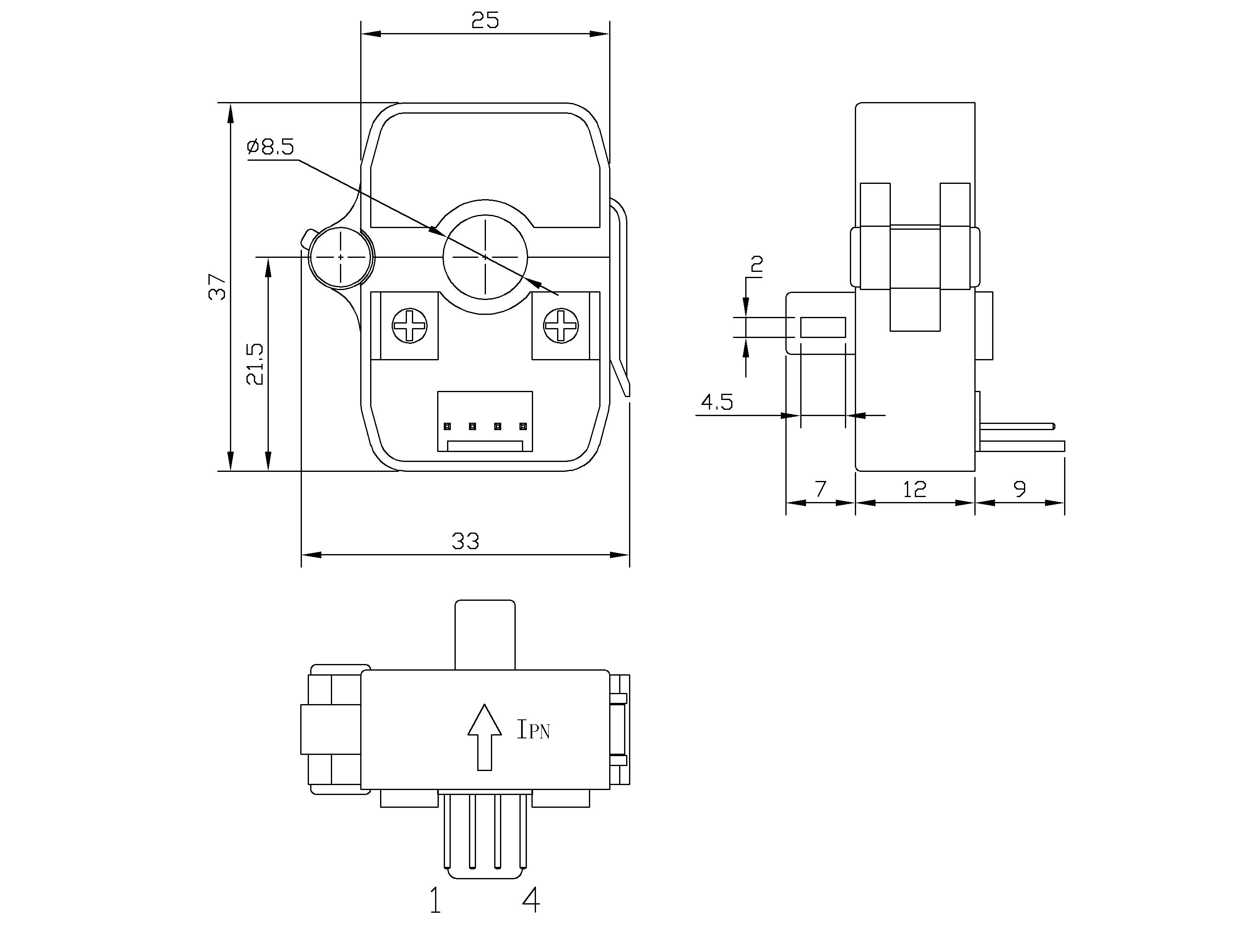 该传感器采用直测式霍尔检测原理工作。原边电流产生的磁通量聚集在磁电路中,并由霍尔器件检测出霍尔电压信号,经过放大器放大,该电压信号精准的反应原边电流。