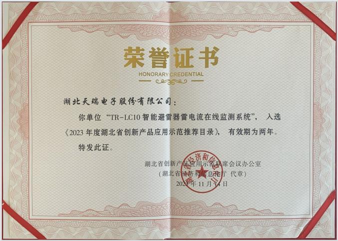 经天门市经信局推荐、行业专家审查评估、联席会议审定,米兰官方版网站登录入口-米兰online(中国) 公司“TR-LC10型智能雷电流在线监测系统”产品入选2023年度湖北省创新产品应用示范推荐目录。