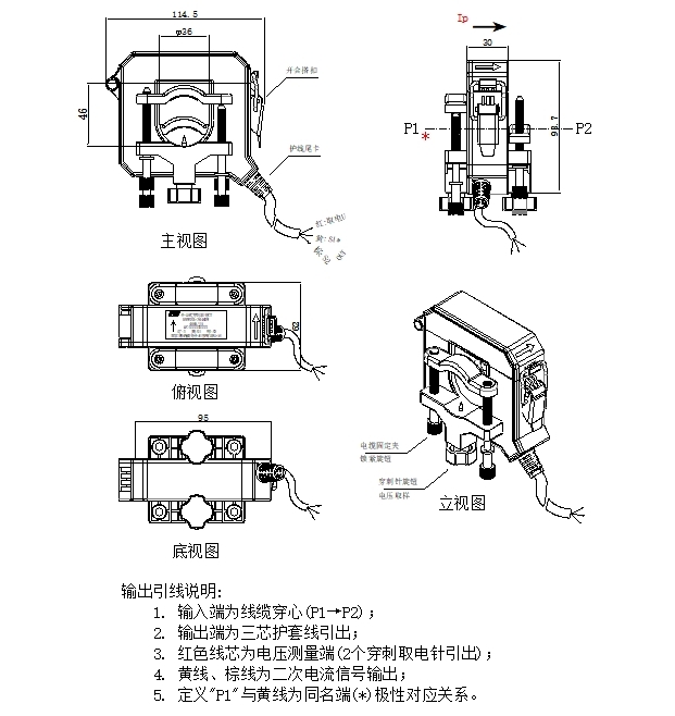 | 电流输出 | 黄线-棕线 | 取电输出 | 红线 | |